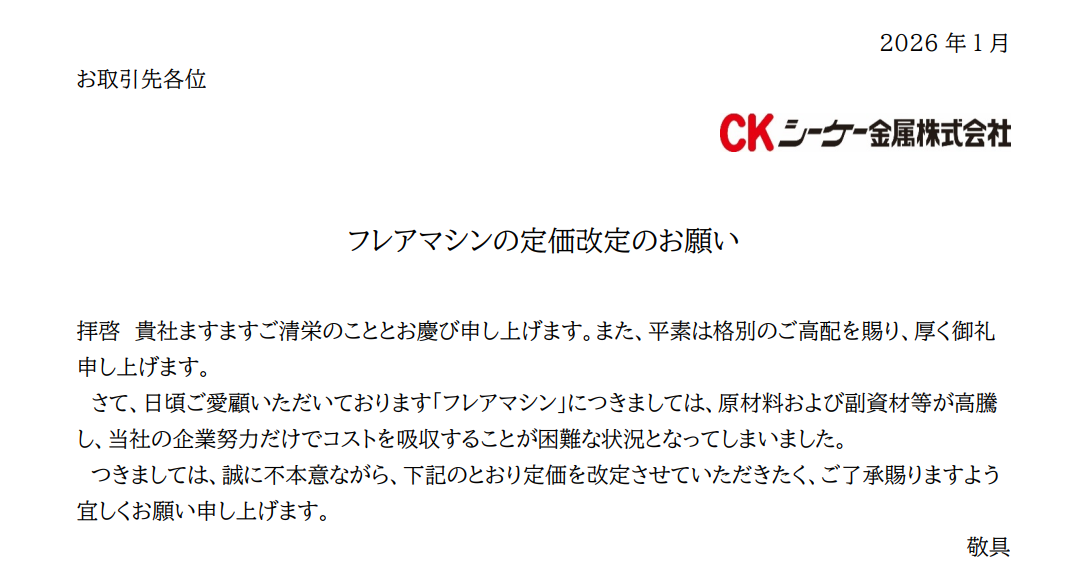日頃ご愛顧いただいております「フレアマシン」につきましては、原材料および副資材等が高騰し、当社の企業努力だけでコストを吸収することが困難な状況となってしまいました。つきましては、誠に不本意ながら、下記のとおり定価を改定させていただきたく、ご了承賜りますよう宜しくお願い申し上げます。