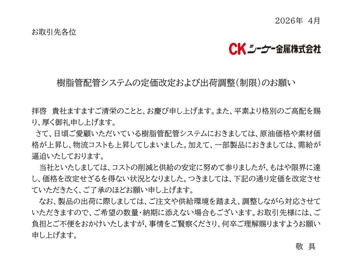 日頃ご愛顧いただいている樹脂管配管システムにおきましては、原油価格や素材価格が上昇し、物流コストも上昇してしまいました。加えて、一部製品におきましては、需給が逼迫いたしております。